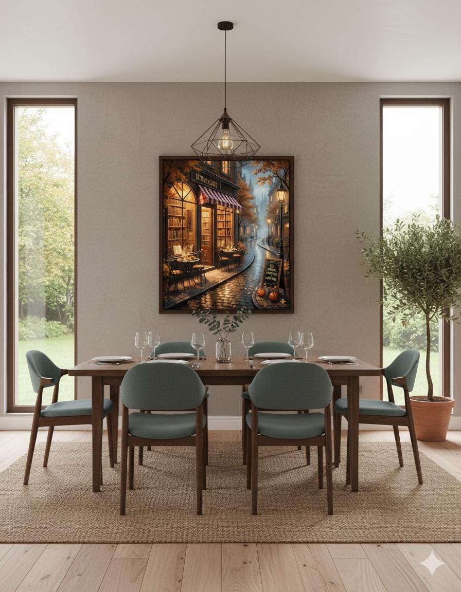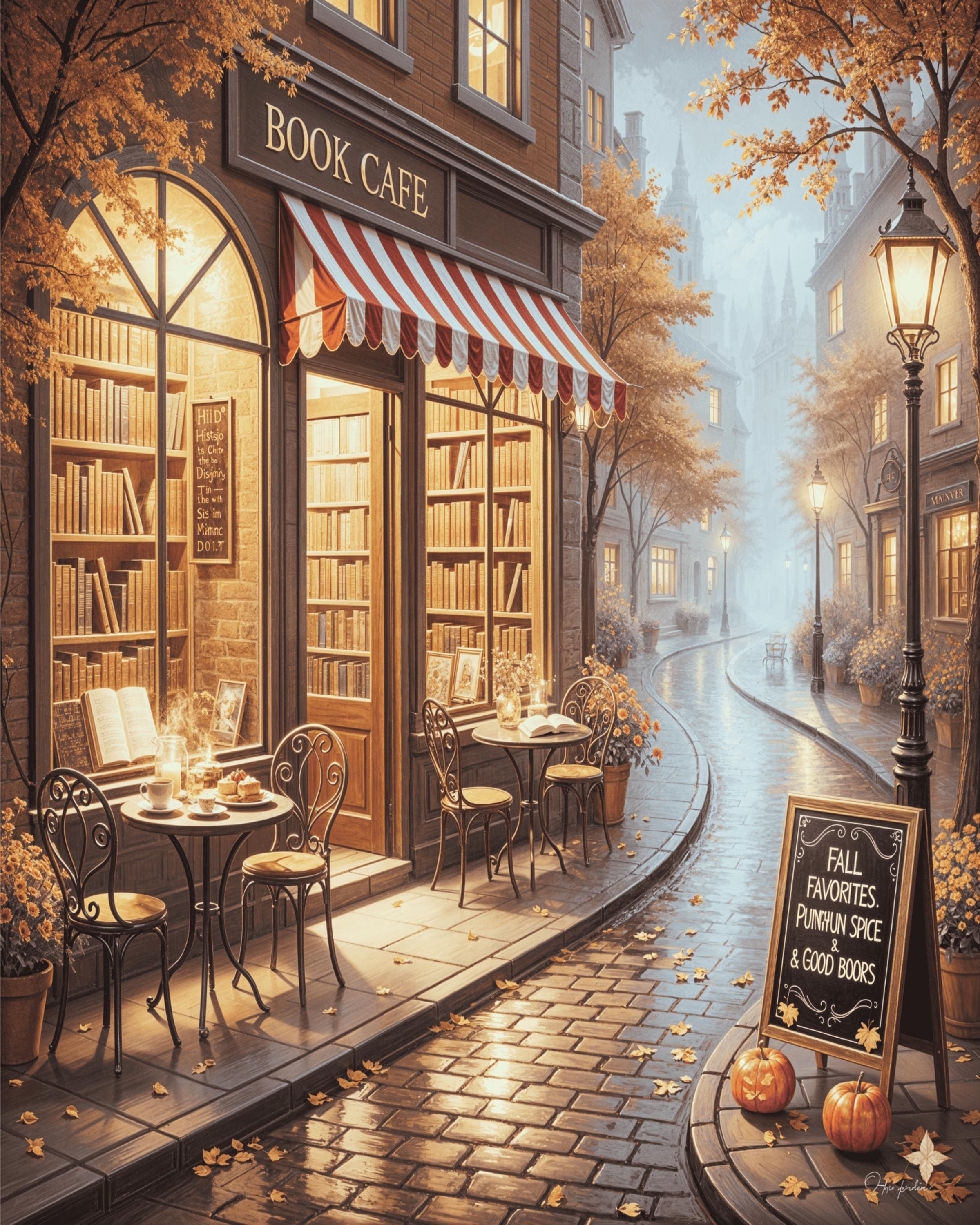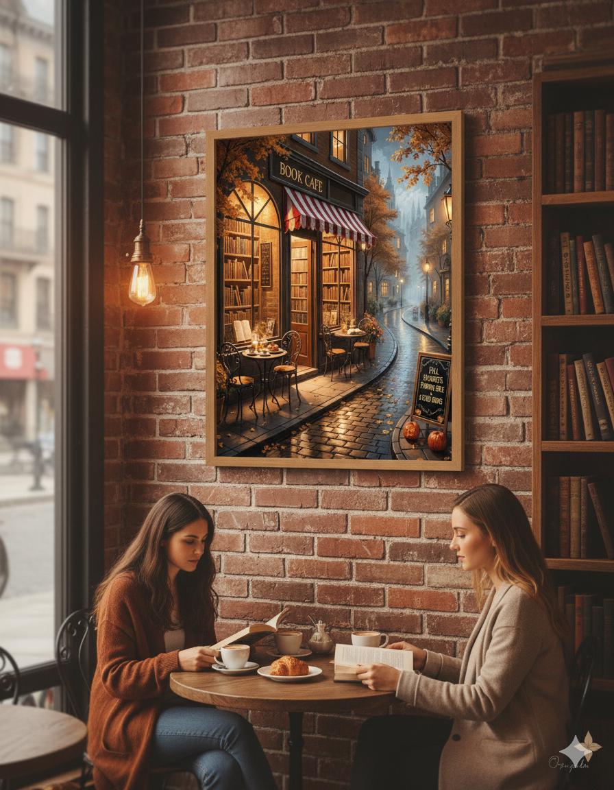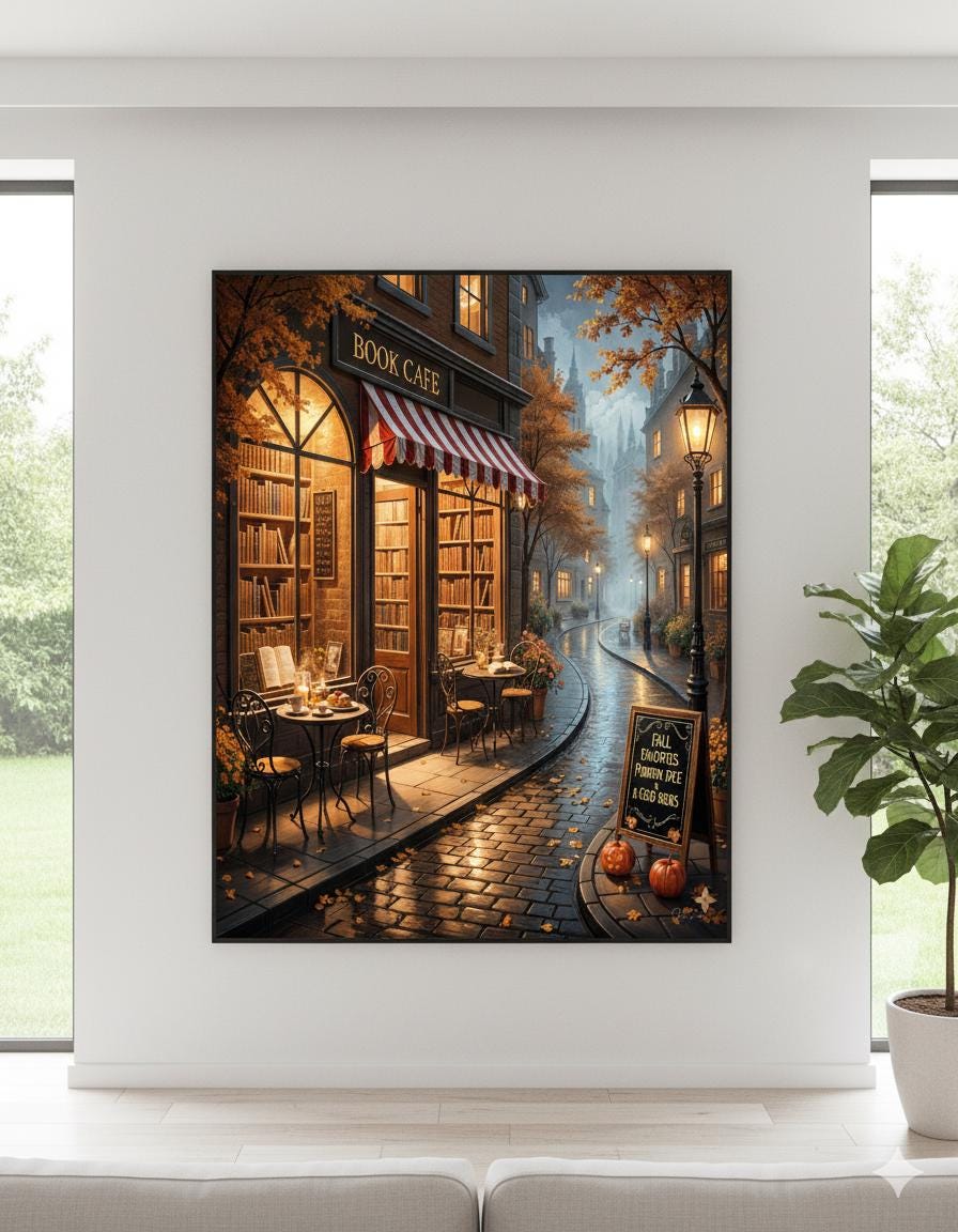 Transform your space into a warm, story-filled retreat with this “Cozy Book Café” digital wall art. Featuring a charming autumn street scene bathed in soft golden light, this artwork captures the perfect harmony of books, coffee, and fall nostalgia. The inviting glow from the café windows, cobblestone reflections, and falling leaves evoke the peaceful comfort of slow mornings and cozy reading afternoons.